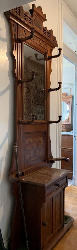This hall tree is walnut and has six original wooden hooks , 2 umbrella racks, a door, a drawer, a marble top, and a mirror. Eastlake Victorian style circa 1890. It has been professionally refinished, and is in excellent condition. Featuring a gracefully arched mirror, framed in rich, aged wood, the Antique Hall Tree exudes vintage charm. The mirror not only adds a touch of sophistication but also serves as a practical element for those last-minute appearance checks before stepping out.